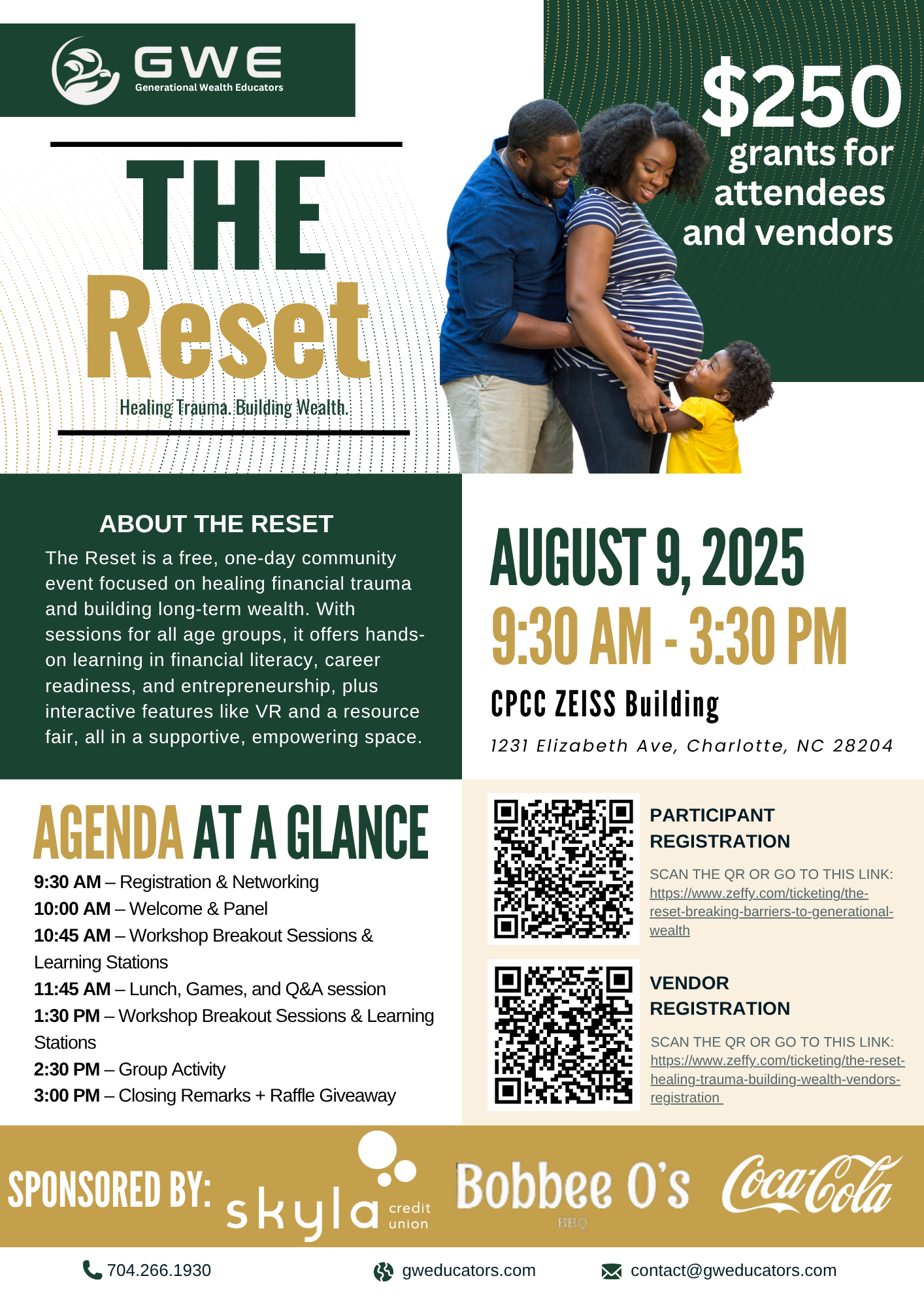 Reset: Healing Trauma, Building Wealth is an empowering community event presented by Generational Wealth Educators (GWE), focused on helping individuals and families overcome financial and personal obstacles through healing, education, and practical tools.